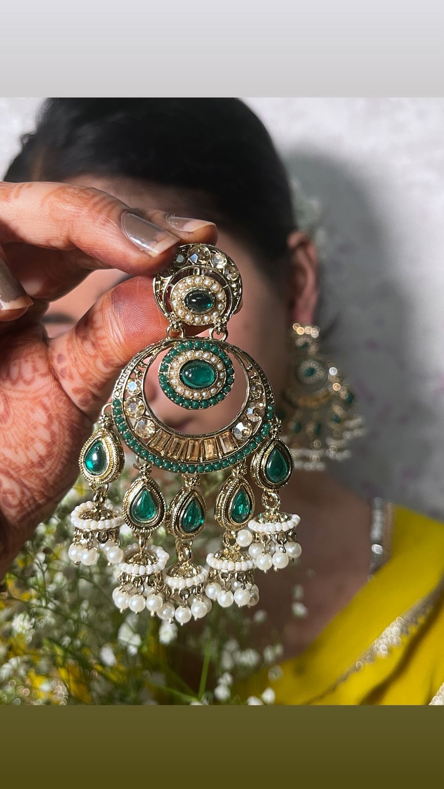 Add a touch of royal allure to your look with these magnificent Emerald Green Chaandbali Jhumka earrings. This design is a superb blend of traditional and modern styles, guaranteed to enhance your grace on any occasion.