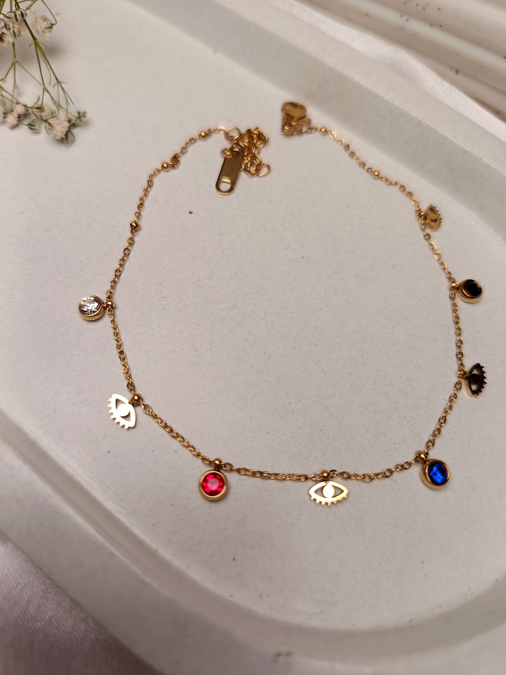 Add a touch of playful elegance to your look with this stunning Dainty Gold Plated Anklet. Featuring a delicate chain adorned with vibrant, colorful gemstone charms, this anklet is designed to capture the light and attention with every step you take. It’s the perfect accessory to elevate your daily style or add a subtle sparkle to your evening wear.