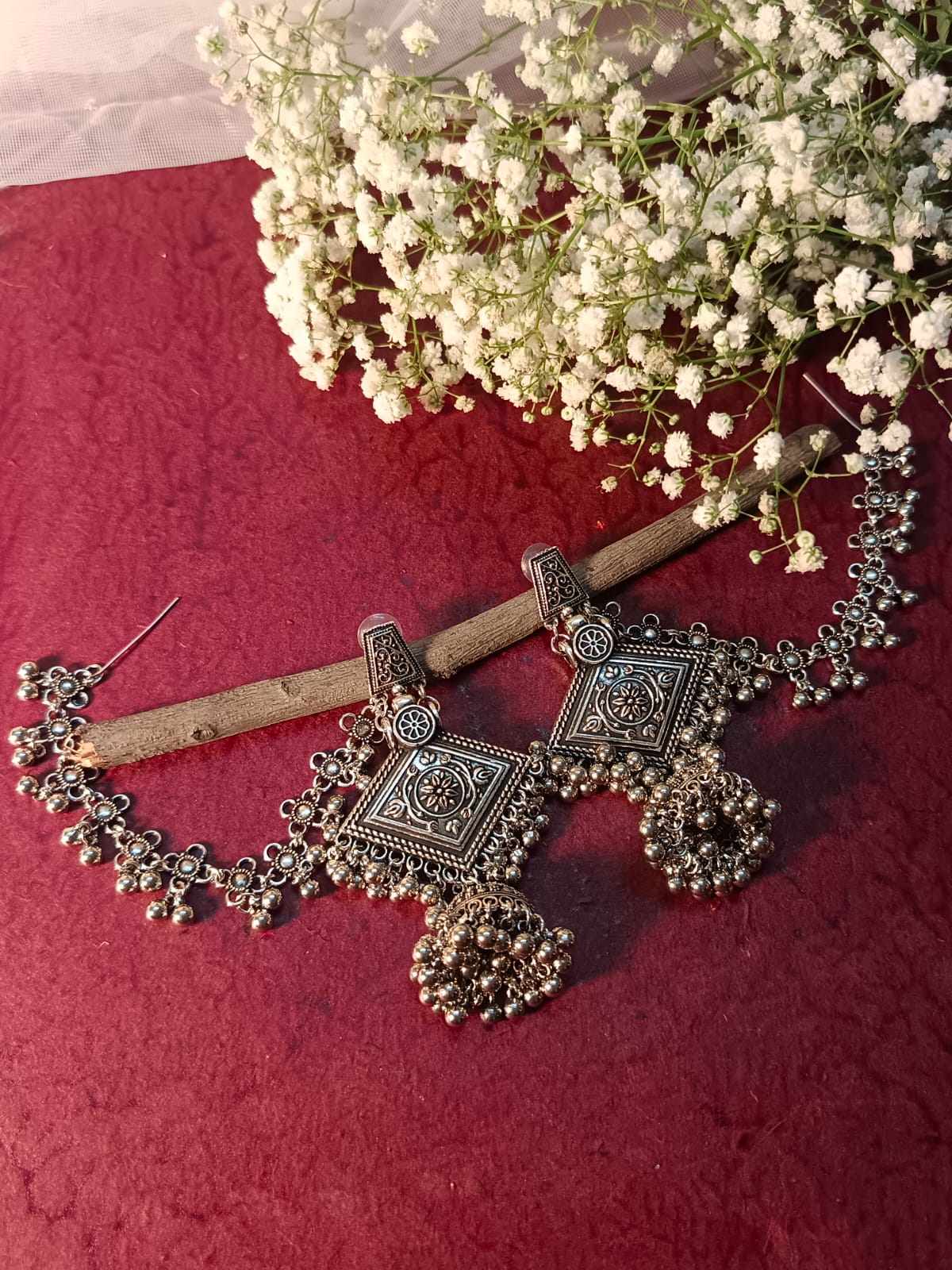 These earrings are a perfect accessory for any festive occasion, wedding, or celebration. The antique finish of the oxidised silver gives them a timeless appeal that pairs beautifully with both traditional and contemporary outfits like sarees, lehengas, or kurtas. They are lightweight and comfortable, designed to add a graceful sway and a subtle chime with your every move.