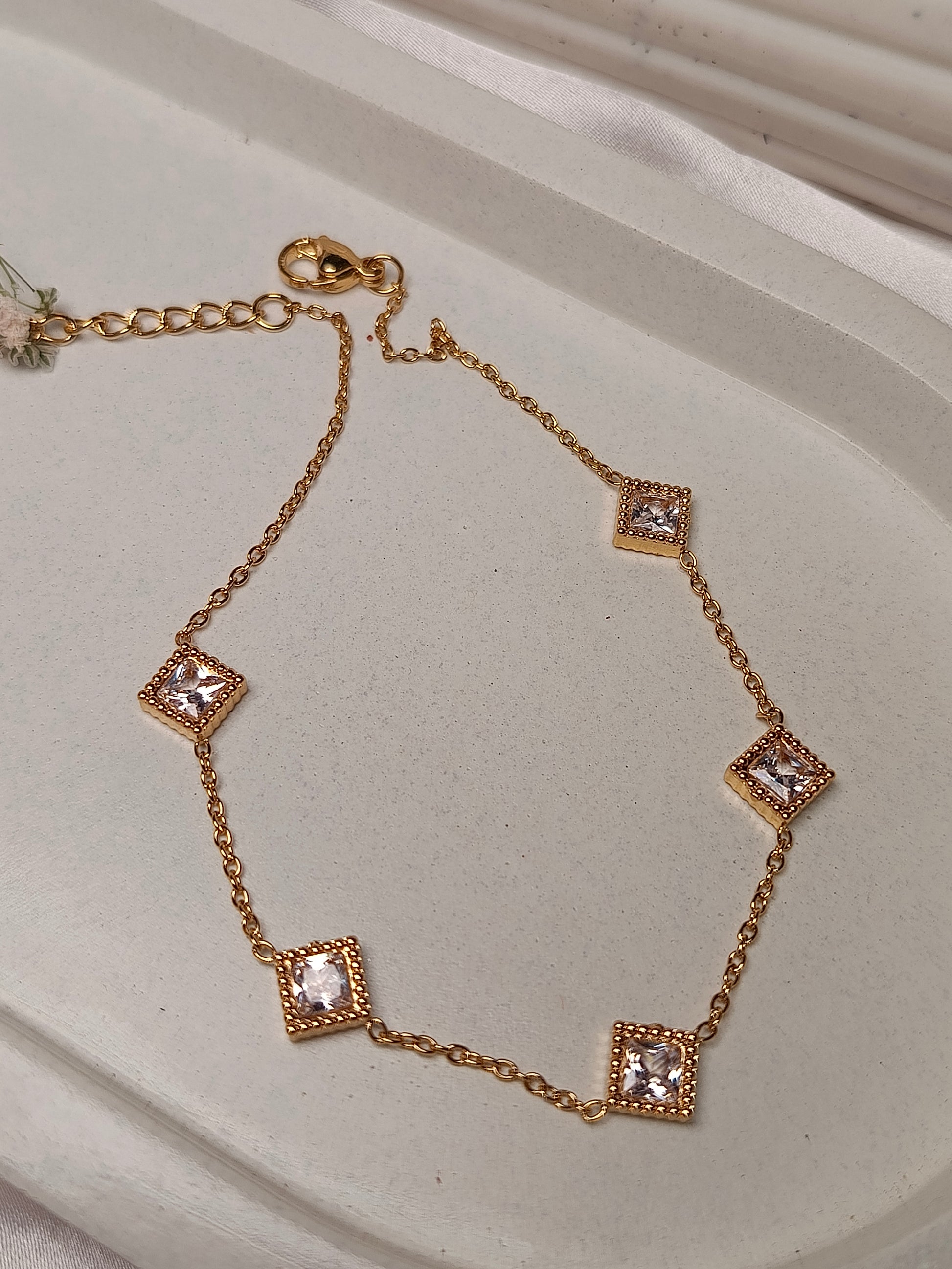 Elevate your style with a touch of refined elegance. Our Radiant Gold Anklet is a stunning piece that combines modern minimalism with a captivating sparkle. This beautiful anklet features a series of geometric, diamond-shaped charms, each meticulously set with a brilliant cubic zirconia stone that catches the light with every step you take. It’s a versatile and sophisticated accessory perfect for any occasion.