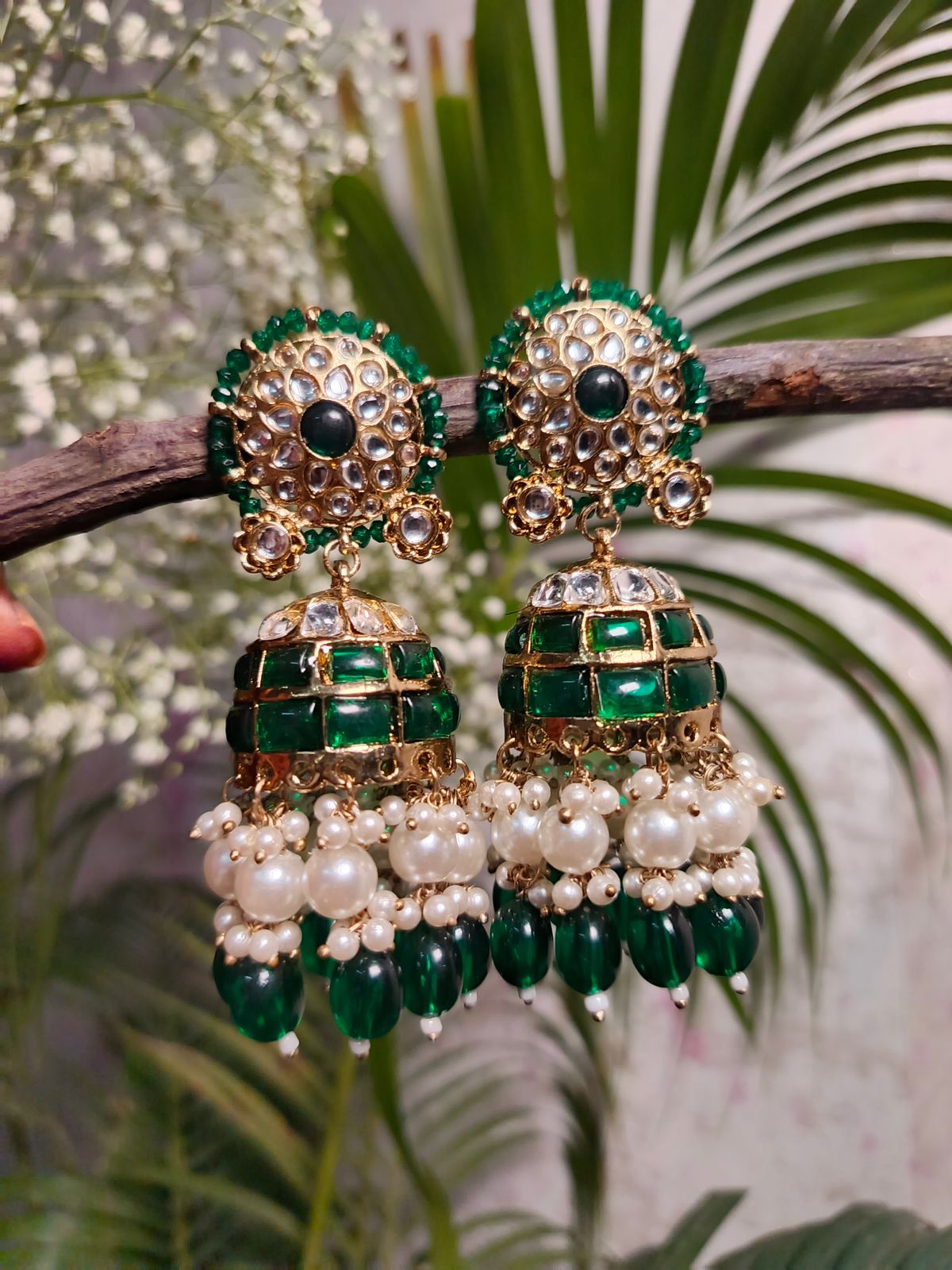 These striking Kundan and Meenakari jhumkas are a must-have for your ethnic jewellery collection. The top stud is a beautiful floral design with intricate Kundan work and a vibrant red stone at its center, surrounded by green stones. The main bell-shaped part of the jhumka features a rich, deep-green enamel finish. A delicate fringe of lustrous pearls and deep red beads hangs below, completing the regal look. These traditional jhumkas are perfect for adding a touch of classic elegance to your festive, wedding, or party outfits.