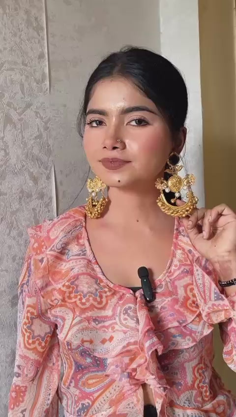 Make a grand statement with these exquisite gold-toned earrings, inspired by the majestic peacock. Each earring features a rich, textured gold base adorned with delicate pearl drops and a charming peacock motif. The design culminates in a stunning, intricate gold dangler, embellished with a multitude of tiny golden beads and pearl accents, creating a beautiful cascade of movement and sparkle. A vibrant, royal blue square stone crowns each earring, adding a pop of regal color. These earrings are a testament to fine craftsmanship and are perfect for adding a touch of opulence to traditional and contemporary outfits alike