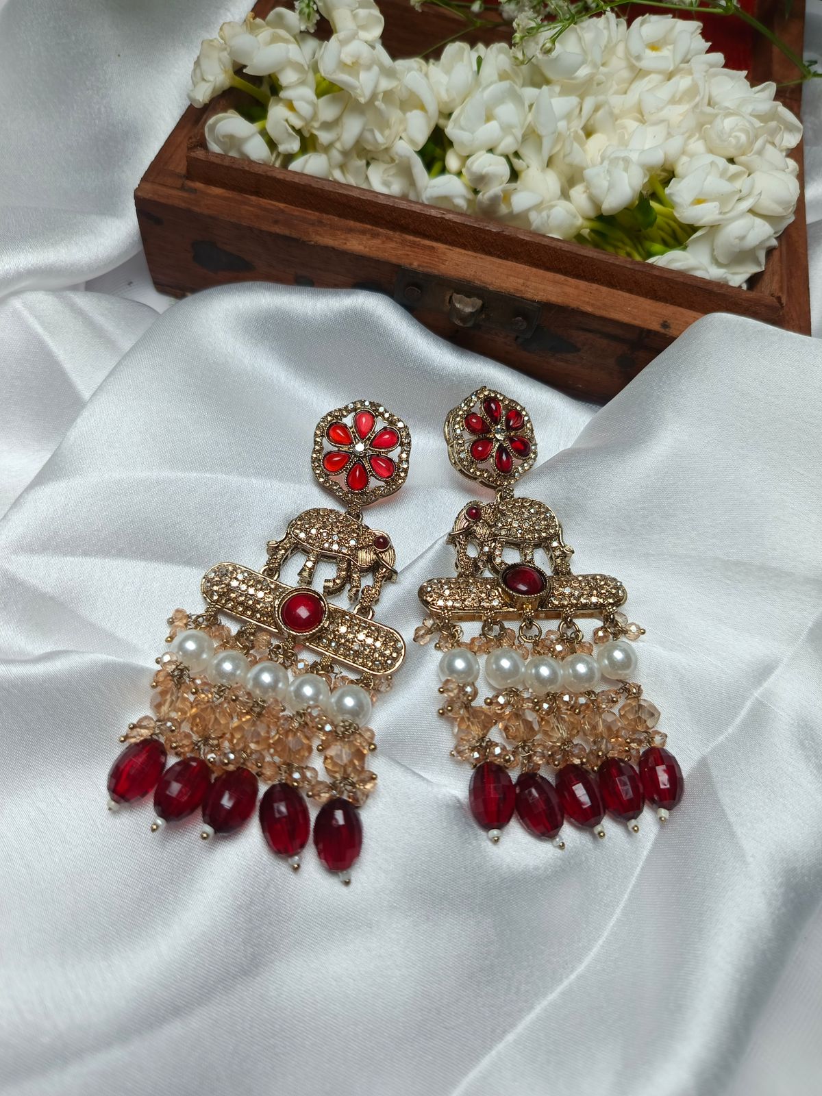 Hanging from the elephant are delicate pearls and clear crystal beads that catch the light beautifully. These ethnic earrings are perfect for formal occasions, adding a touch of elegance and grandeur to any traditional outfit. The design reflects classic Indian jewelry artistry, making them a timeless and cherished accessory.